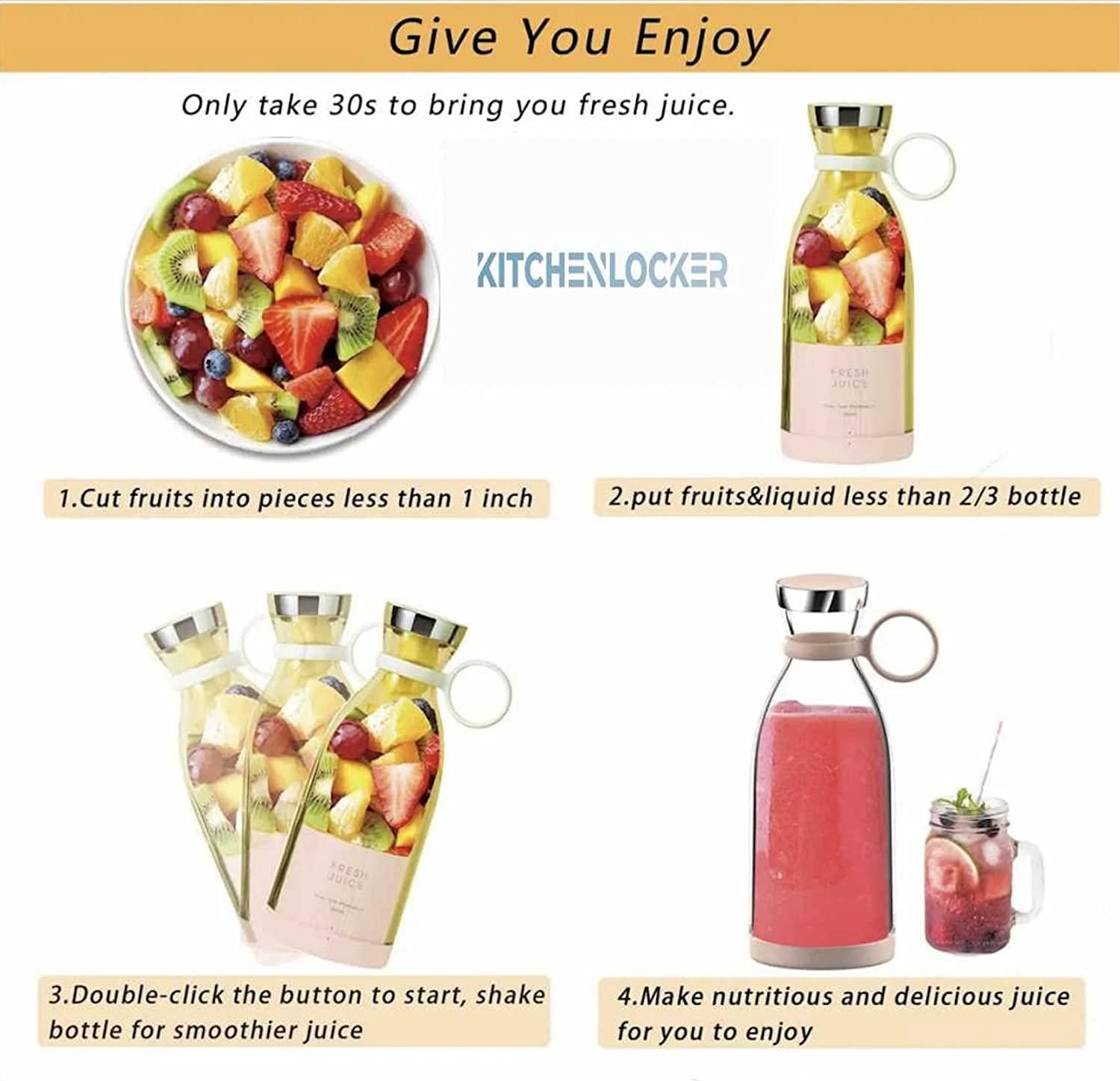 Rechargeable Portable USB Juicer Bottle Electric Mixer Blender Smoothie Maker Grinder -4 Stainless Steel Blades 30 watts 380ml For Fruits, Drinks, Shakes Sports, Travel, Outdoor, Gym, Kitchen
